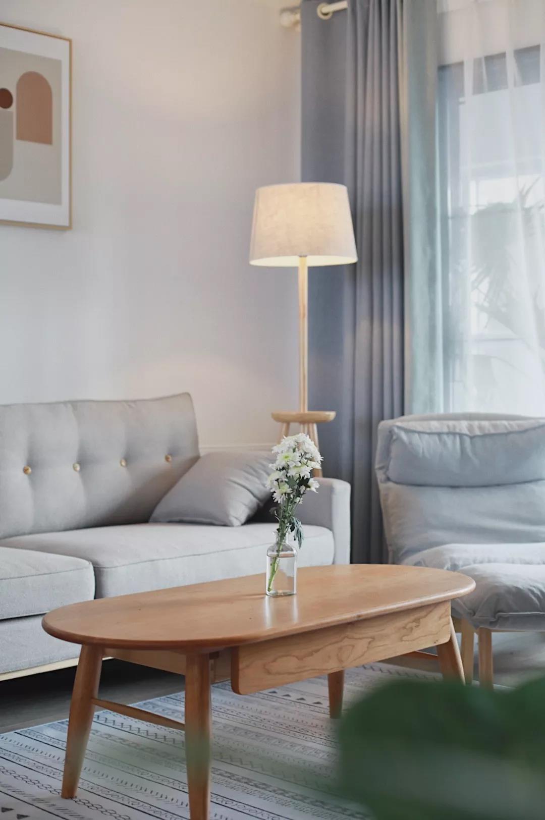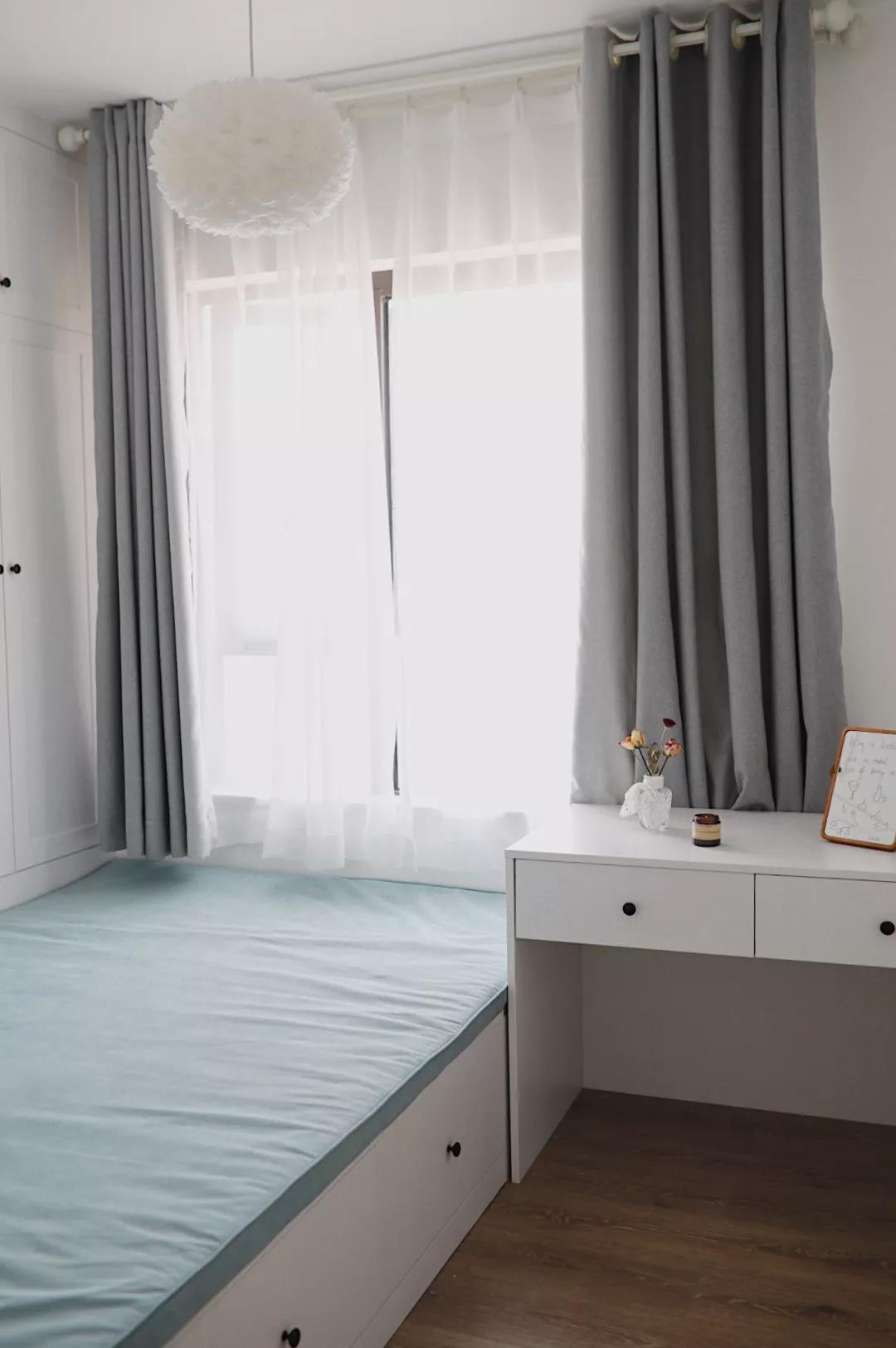 搭配米白色吊灯,拉上白纱窗帘,很是温馨。