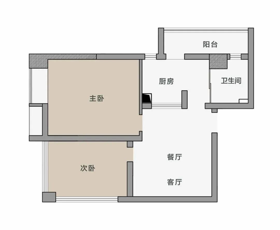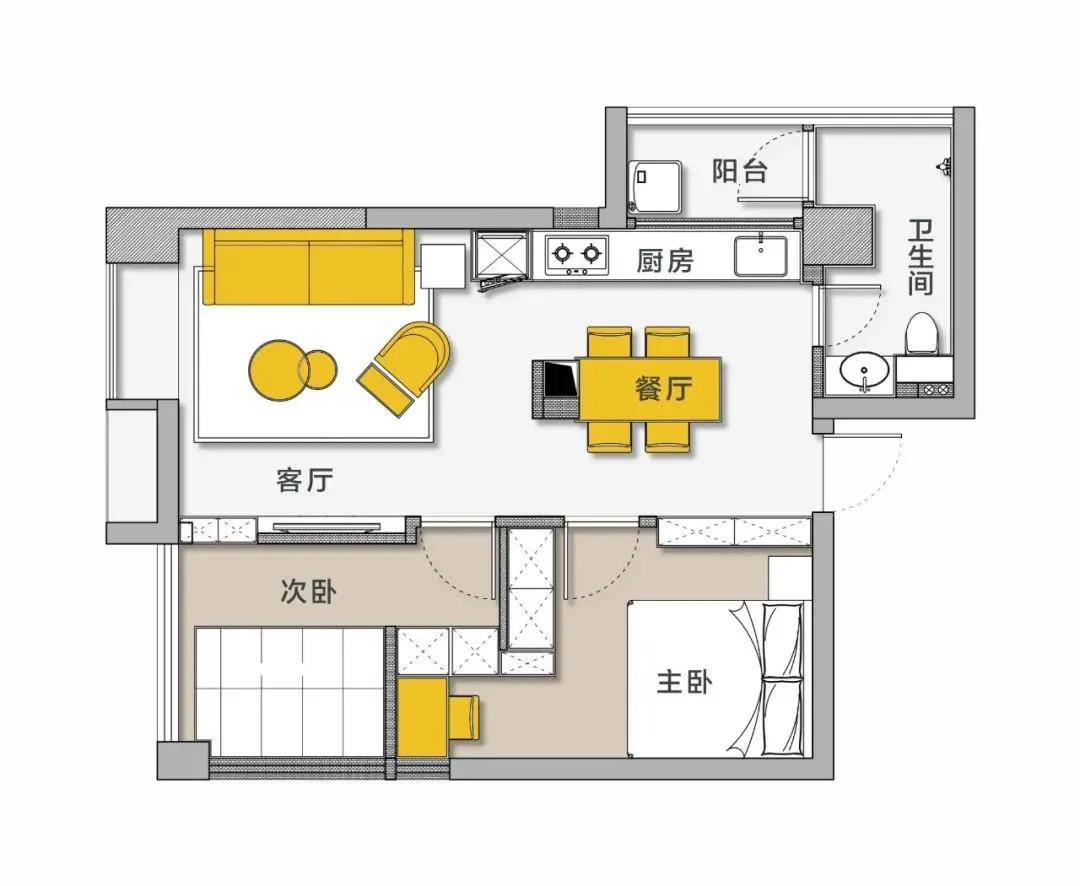 ● 客餐厅面积局促且无自然光,主卧与客厅位置互换,让暗厅有自然光照入