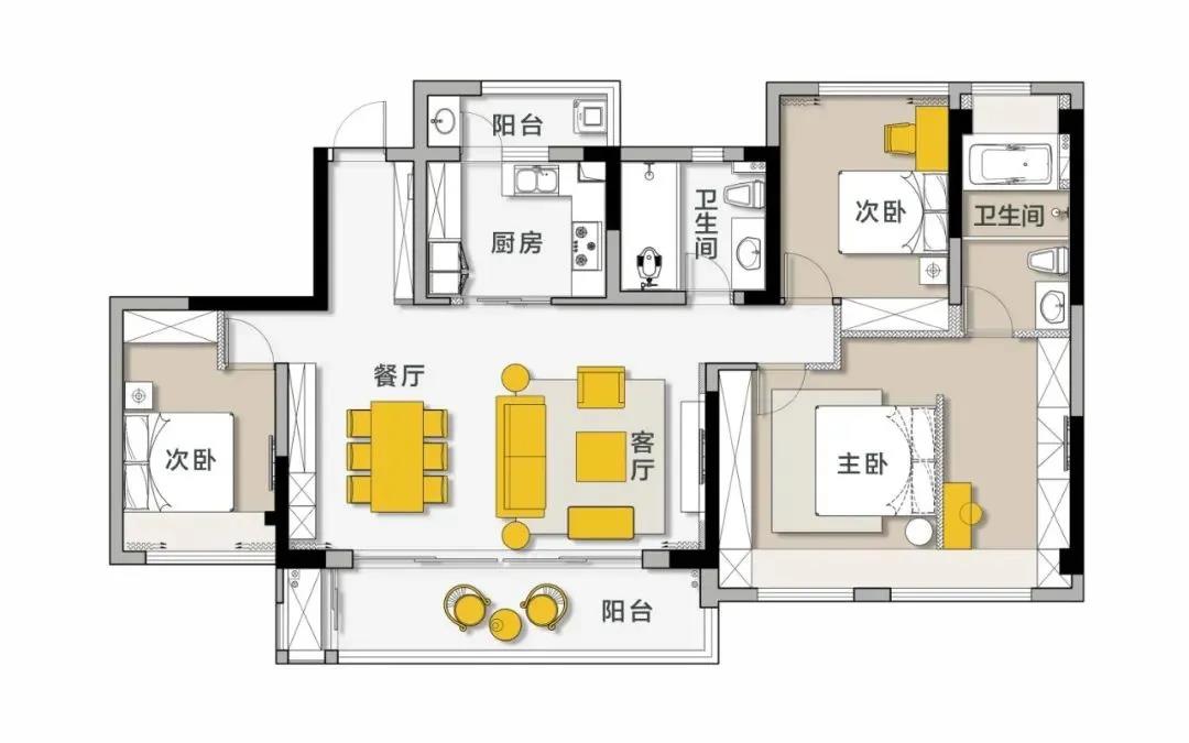 3.利用过道空间扩大主卫面积,使其同时满足浴柜、入厕、淋浴、浴缸四个功能。