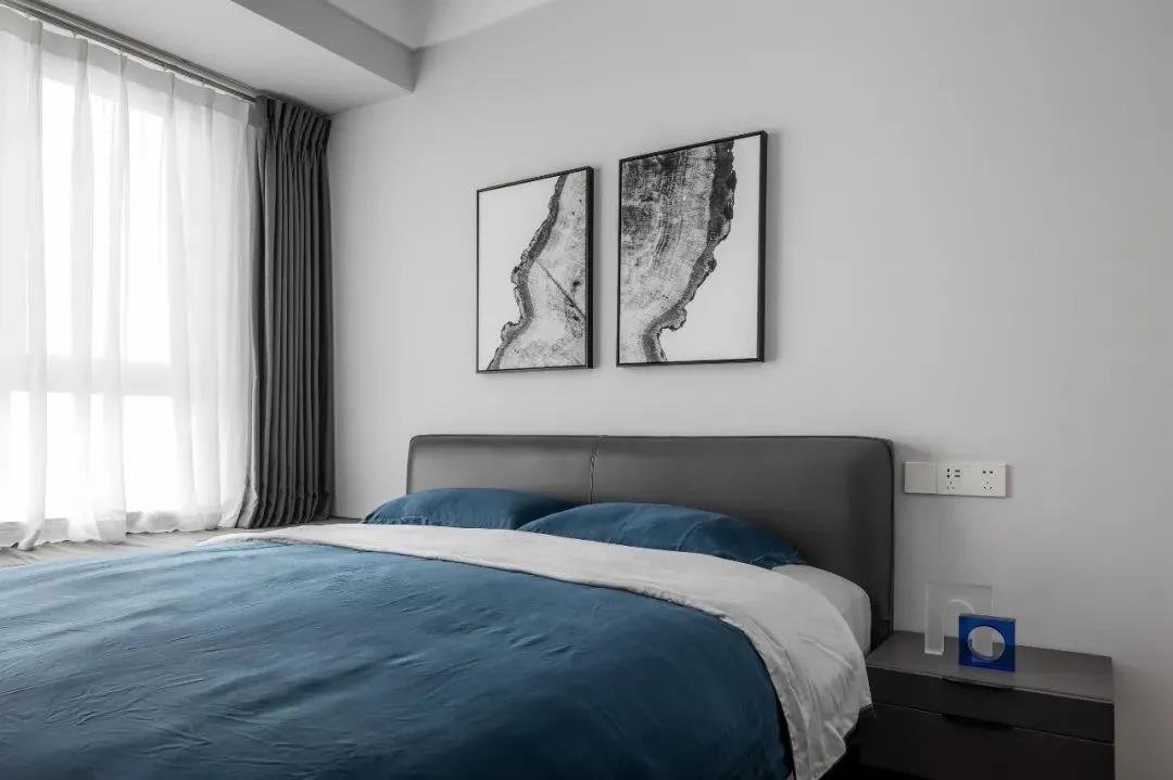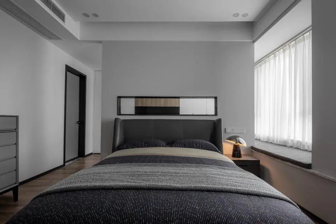 父母房延续黑白整体色调,以深蓝色进行点缀,让空间看起来简约大气。
