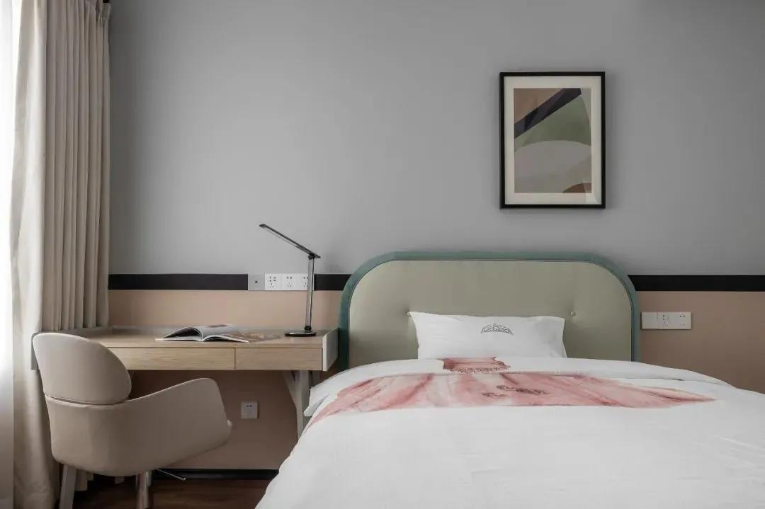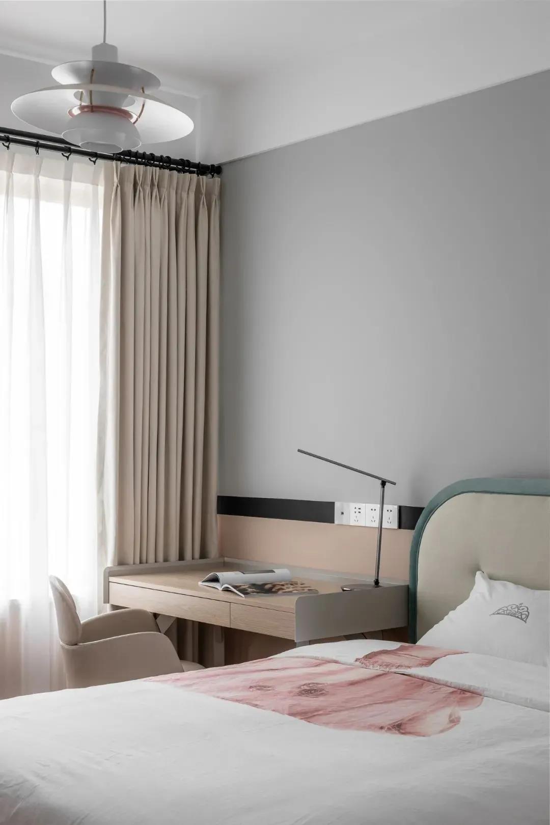 儿童房则是简单的灰白色调,豆蔻绿和粉色注入活力,可爱的飞碟吊灯、动物图案的床品增加童趣。