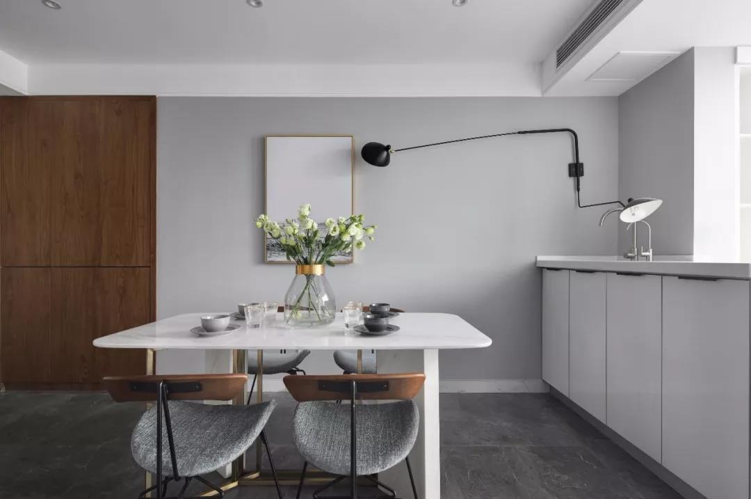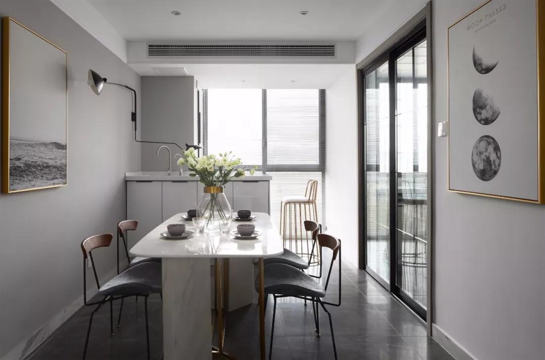 餐厅和厨房间采用玻璃门作为隔断,且设计师还将一部分阳台的区域扩入餐厅,额外打造了一个西厨区域。