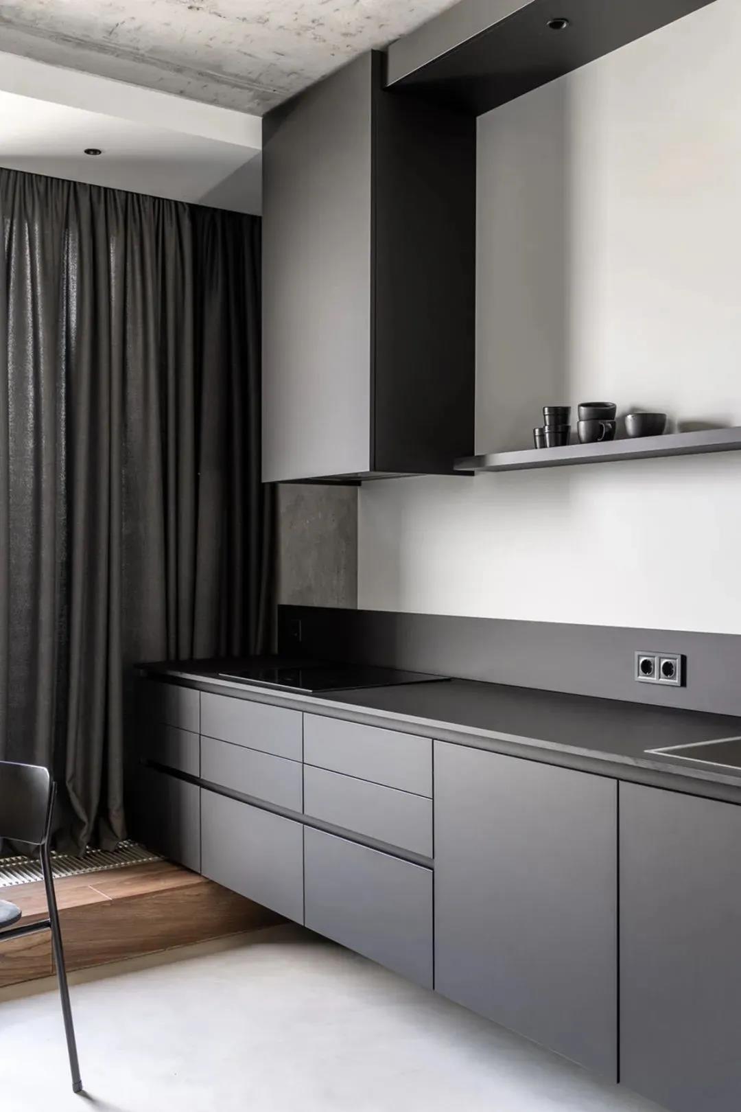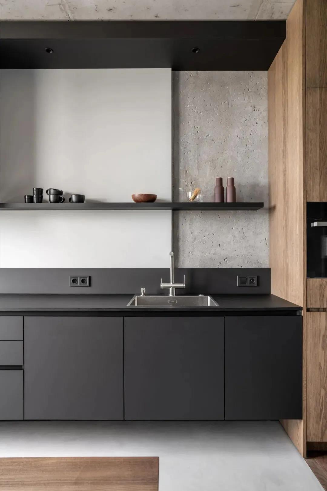 干净利落的黑色哑光橱柜占据了厨房的大部分面积,极简到底