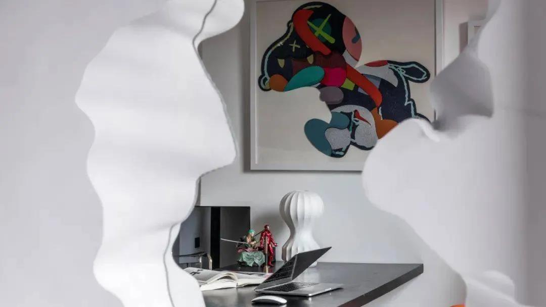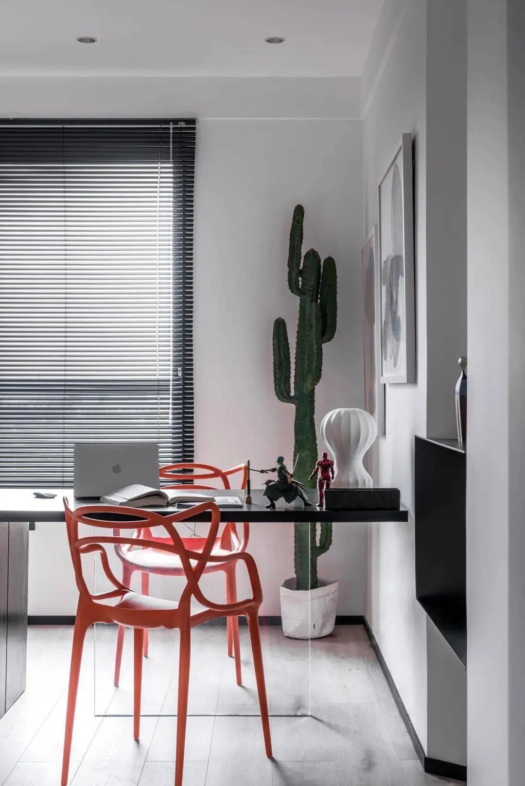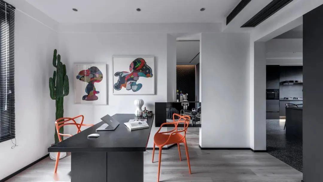 书房是一个半封闭的空间,与客厅 呈半联通状态。两个房间的人可以偶尔互动,又不会相互打扰。