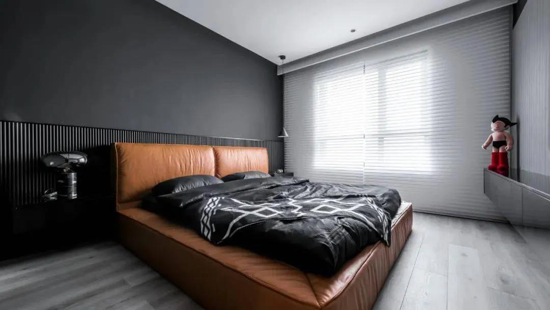 棕色的床以及白色的百叶窗和天花板中和了黑色墙面带来的冷酷感,既保留了黑色的低调高雅,又还给卧室应有的温馨与安宁。