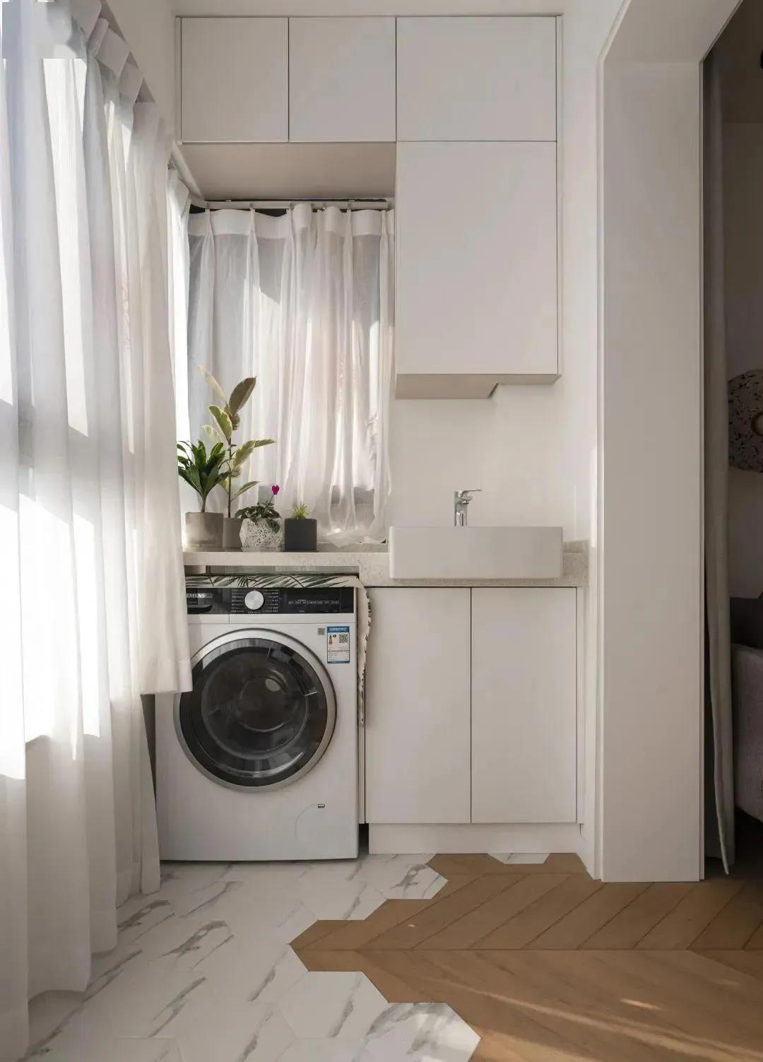 洗衣区放到了阳台,洗手池上下方都做了柜体,方便使用和收纳。