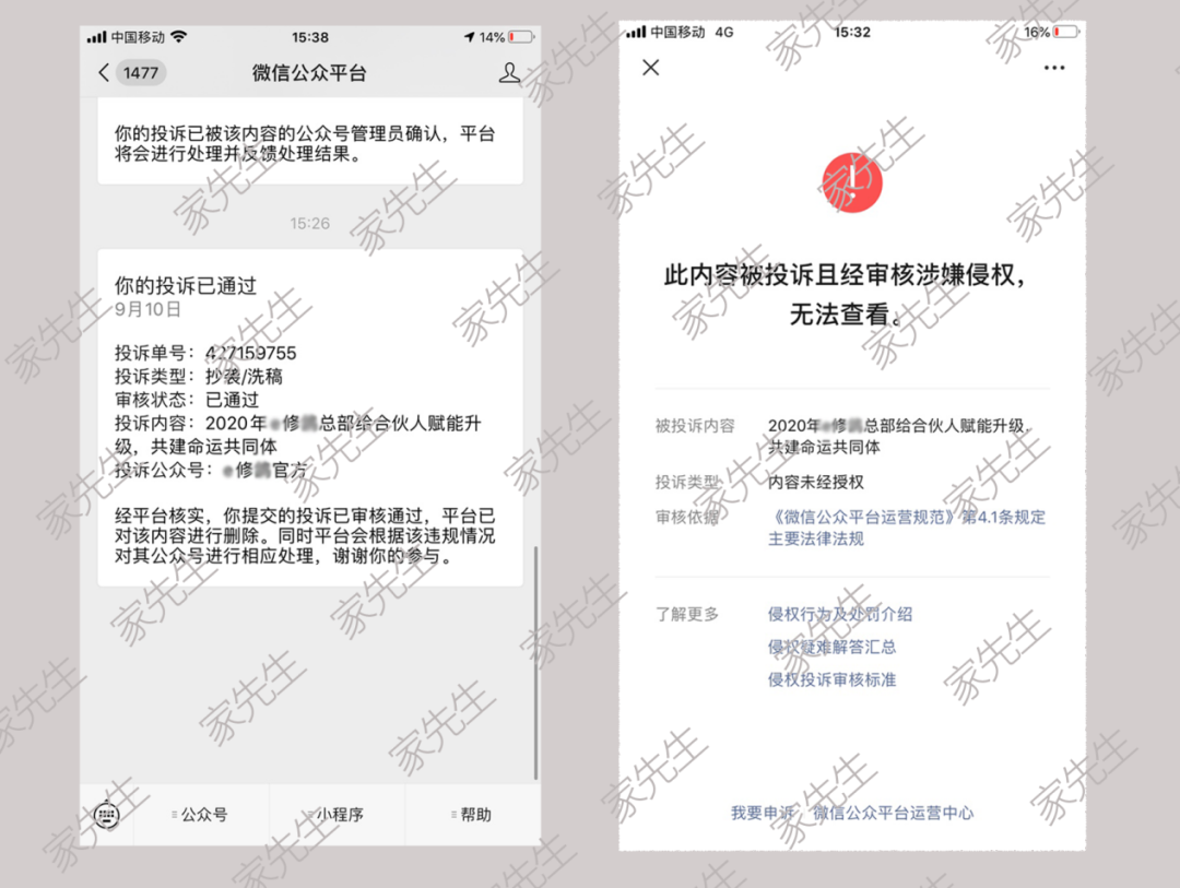 经过家先生全体同仁及服务商的共同举证努力下,维权取得阶段性成果:相关侵权文章已被腾讯公众平台官方强制删除。