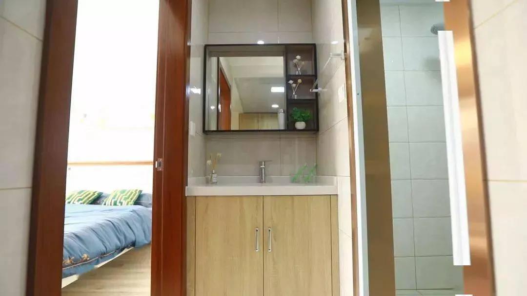 外移的洗漱区刚好卡在次卧和卫生间之间,不浪费一寸空间。