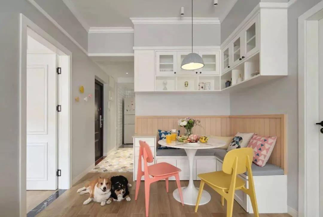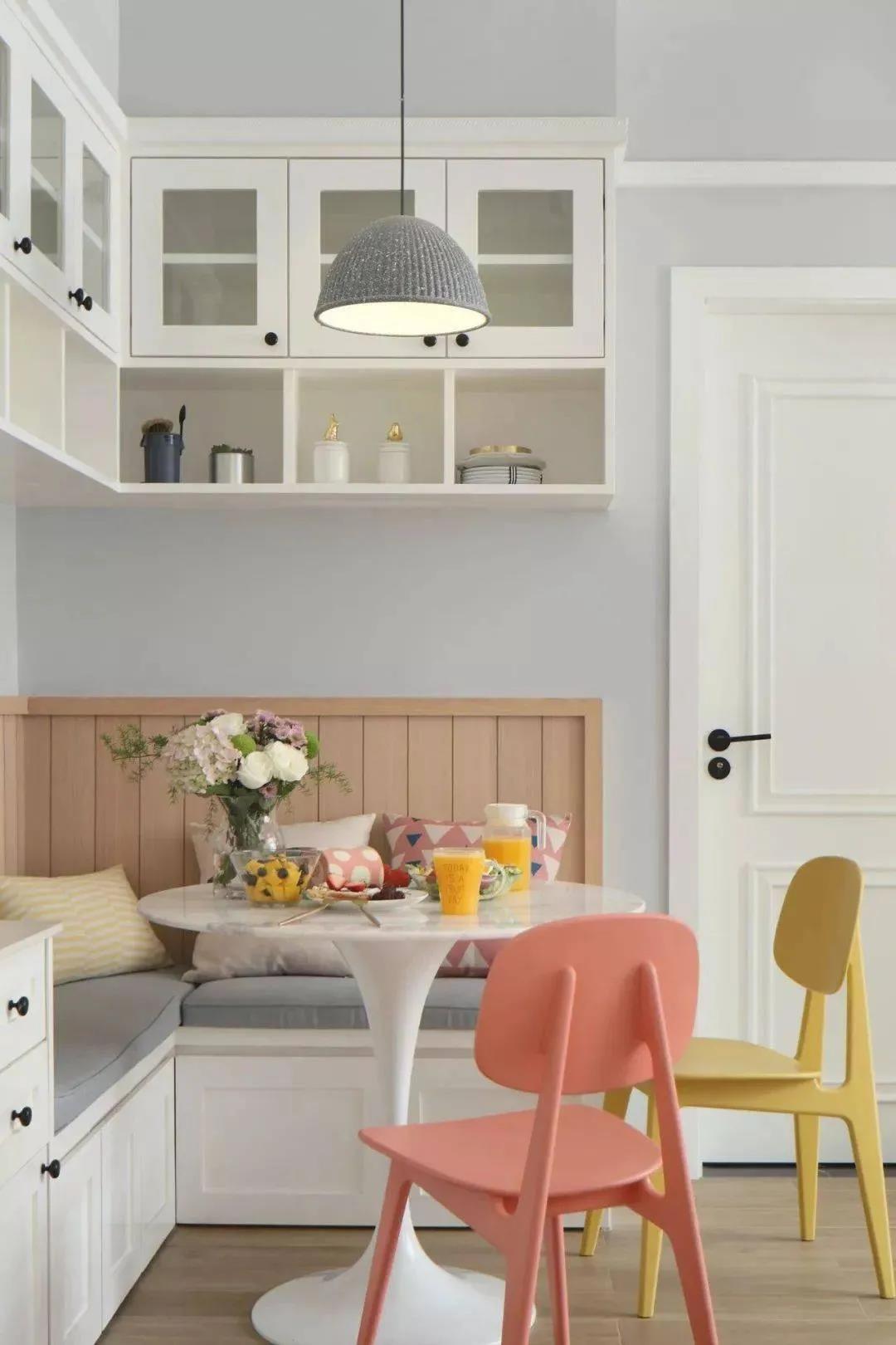 餐厅设计了一个L型卡座,卡座后方是木色的护墙板,粉、黄色的小餐椅,搭配吊柜餐边柜,打造出实用温馨的小餐厅。