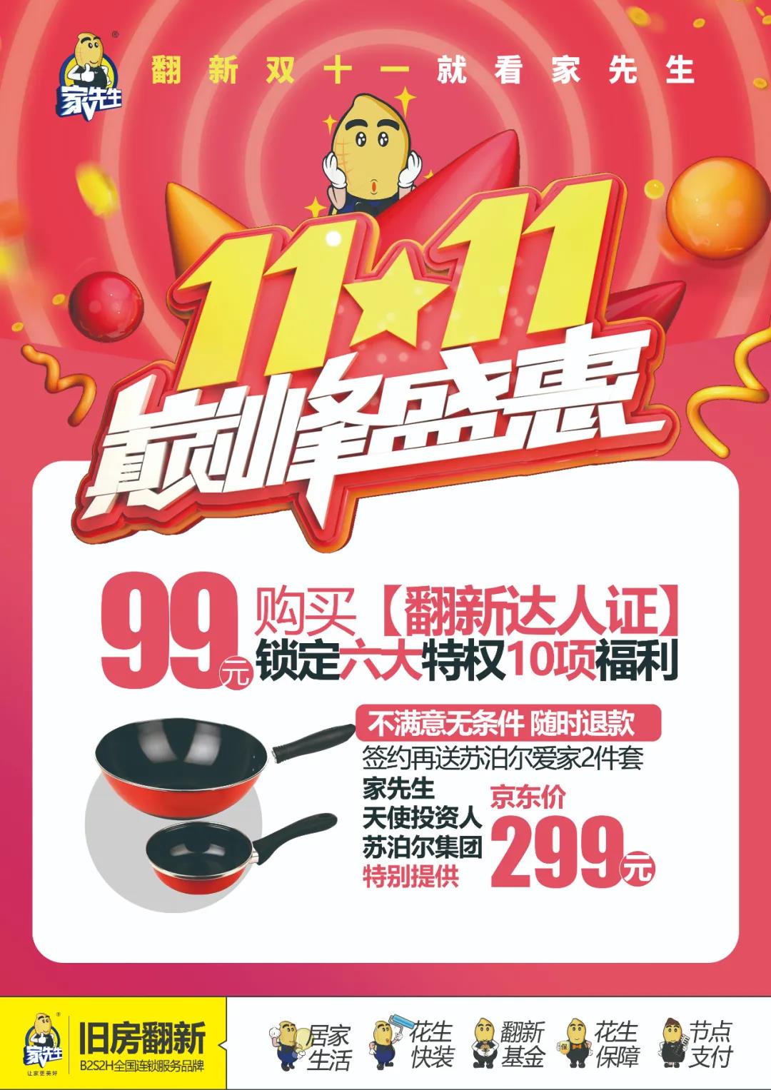 活动期间,花99元购买家先生【翻新达人证】即可锁定5大特权10项福利,签约再送价值299元的苏泊尔爱家2件套,如果不满意可以无条件退款!