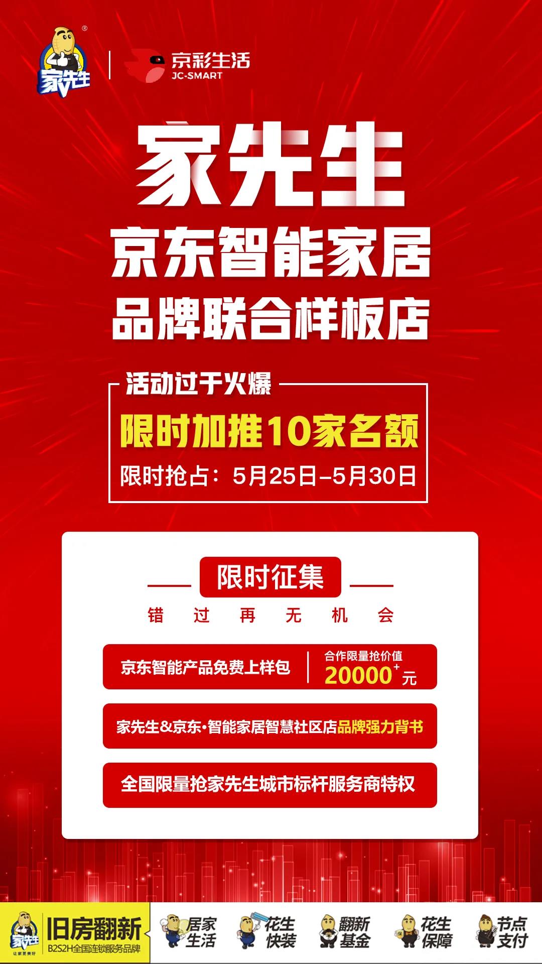 此次合作,家先生将与京东智能家居品牌联合,限时征集10家样板店,错过再无机会!