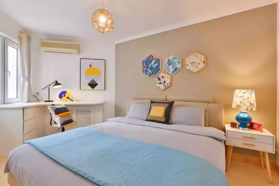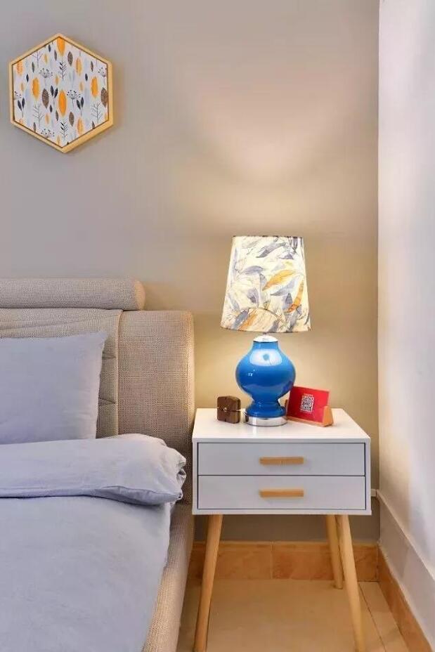 再用几个蓝色的小物件与卧室温暖的氛围形成碰撞,成为卧室中的亮点所在。