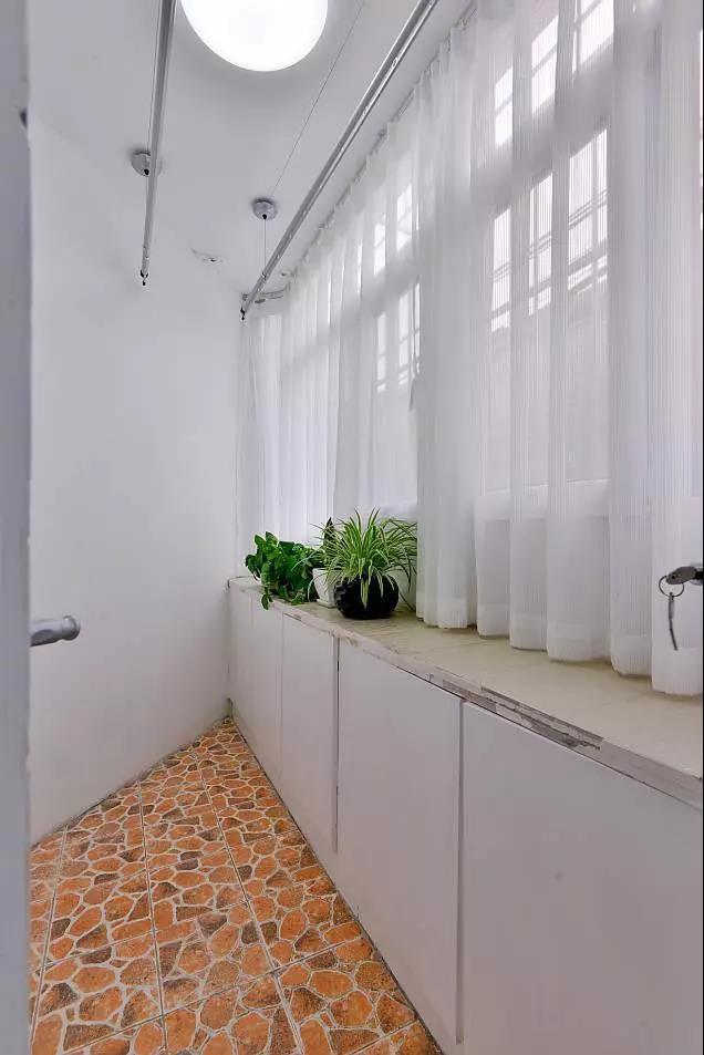 阳台将原有柜子进行了简单的刷漆,搭配白色纱帘,显得分外素雅;再加上两盆绿植作为点缀,显得生机勃勃,绿意盎然。