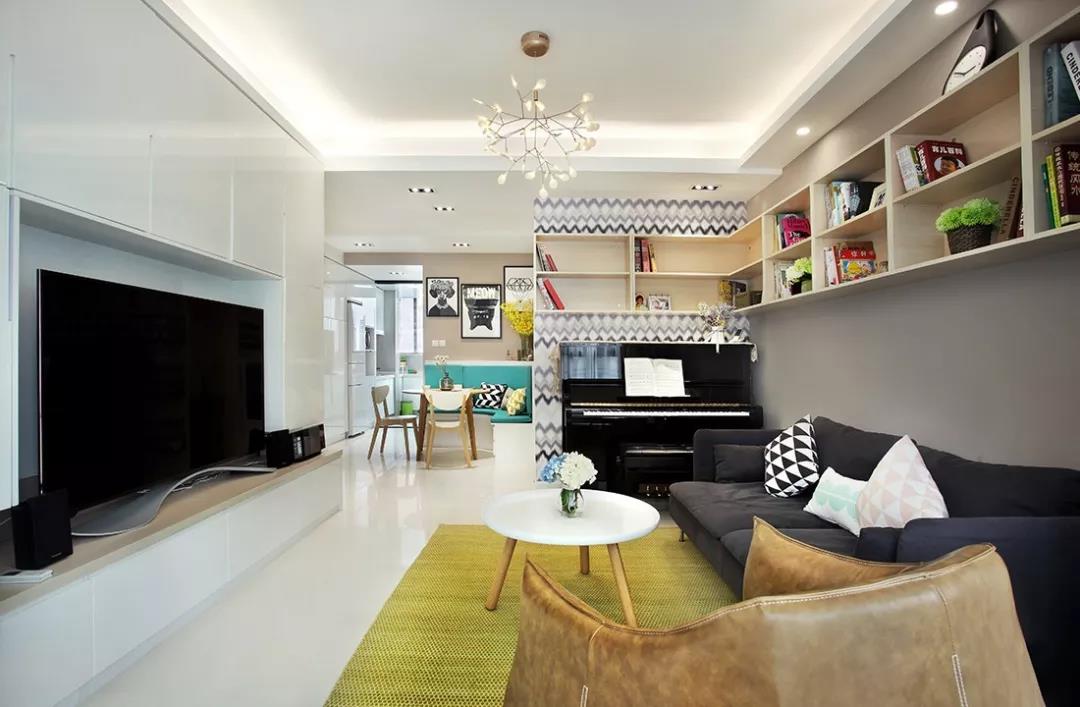 为保证收纳,将电视墙全部做成储物柜,采用弹出器设计,整片电视墙显得简洁、大方!