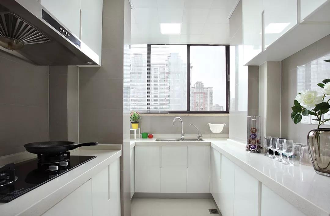 厨房保留了原来的布局设计,在此基础上进行了橱柜的整装。上下橱柜设计,保证了足够的收纳。