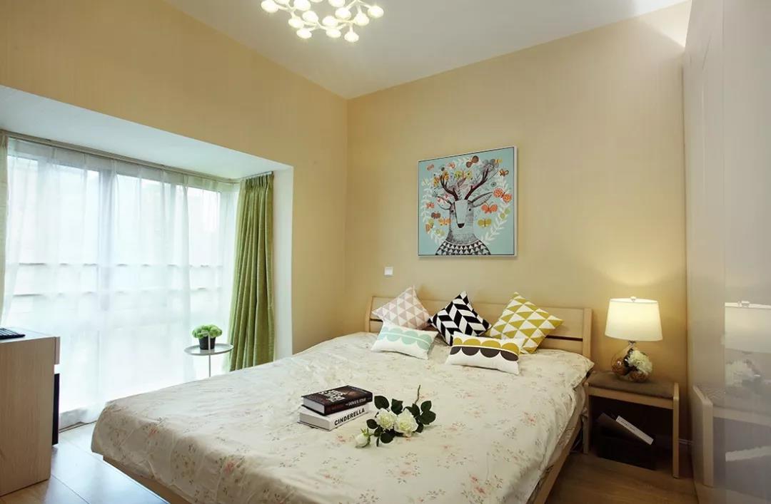 卧室采用优雅的鹅黄色作为主色调,配上白色的床铺与柔和的灯光,营造出了一个温暖的睡眠空间。