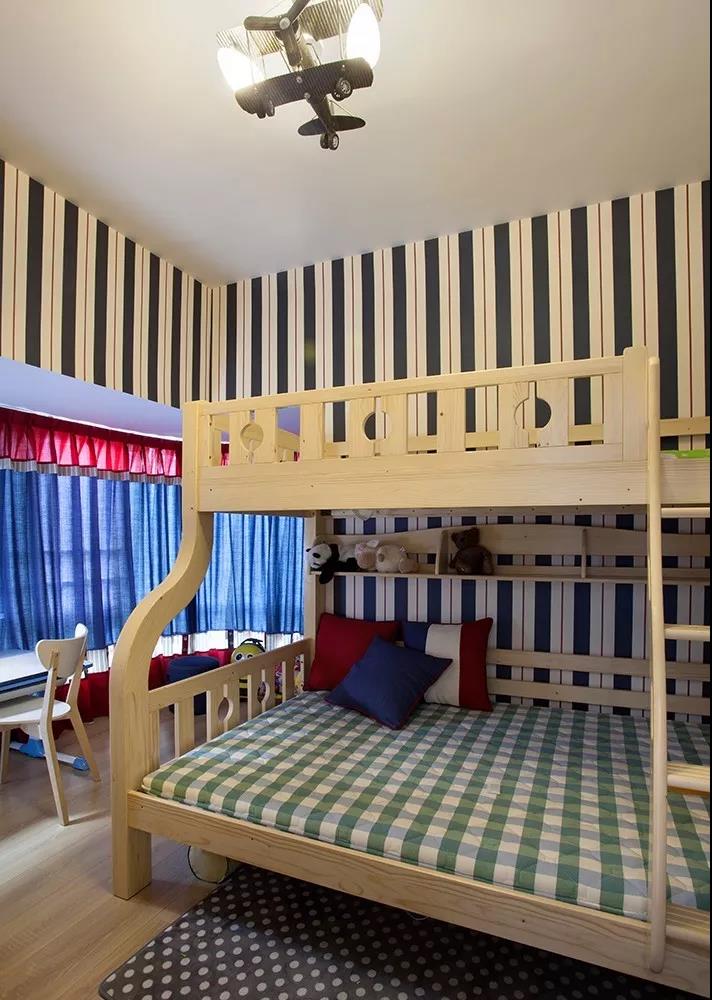 儿童房利用灰白相间的竖条纹墙纸,搭配蓝红配色的窗帘、格子床单,让儿童房显得丰富多彩,又不会过于鲜艳,能够增强孩子对世界的认知。