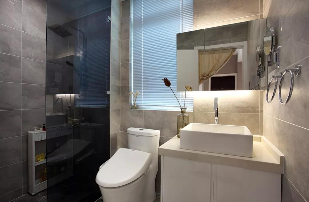 卫生间采用黑色钢化玻璃实现干湿分离,空间虽小但功能齐全,利落又干净。