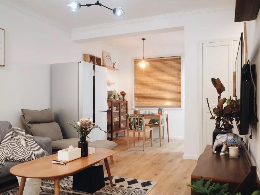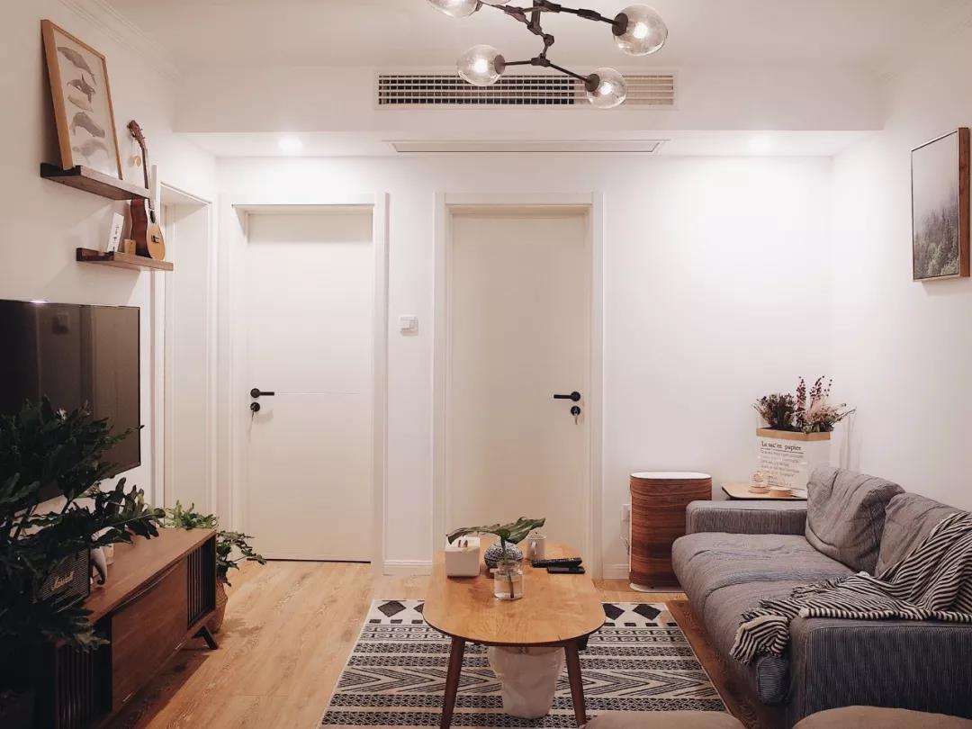 茶几、电视柜采用了原木色木质家具,体现了日式风格的味道。地毯、沙发、挂画,摆件则是偏简约的北欧风,两种不同的风格在客厅中互相映衬显得相得益彰。家先生