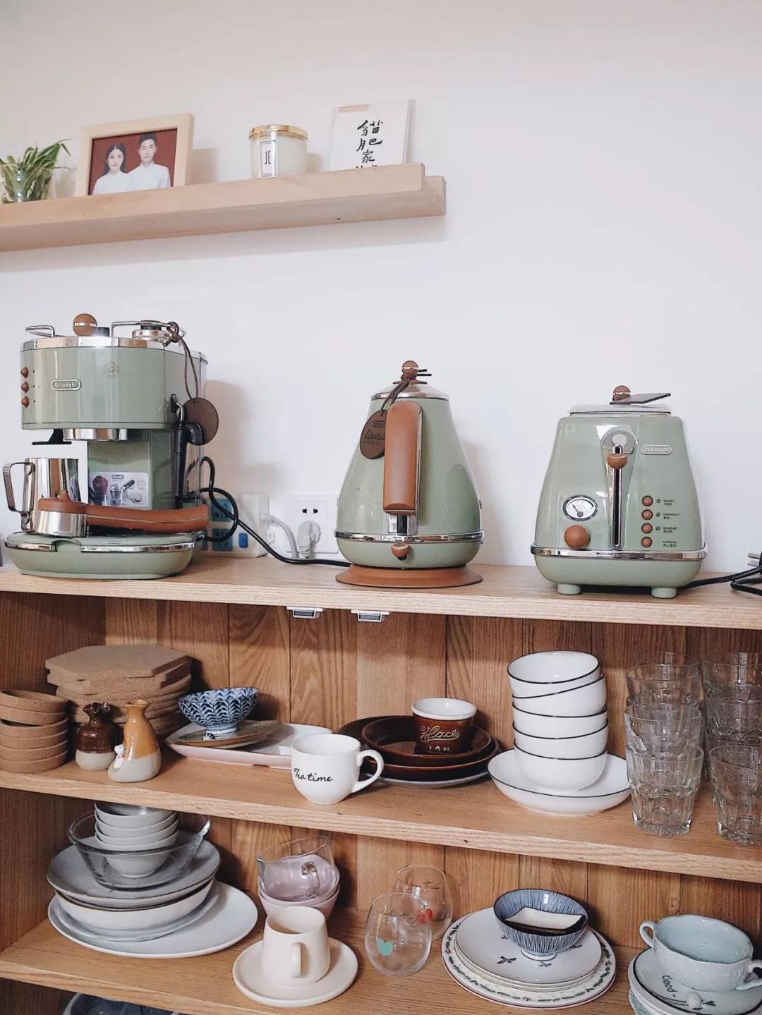 厨房采用L型布局,为保证收纳,还在右侧的墙面做了三层的隔板用于收纳。