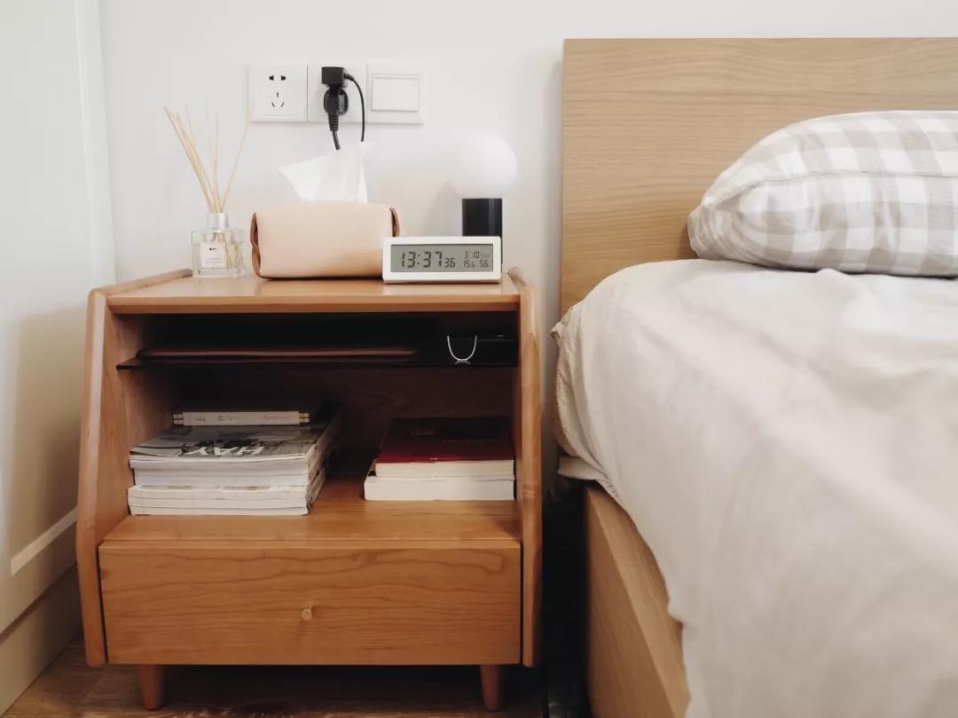 原木色的开放床头柜主要用于放置书籍,拿取十分方便。
