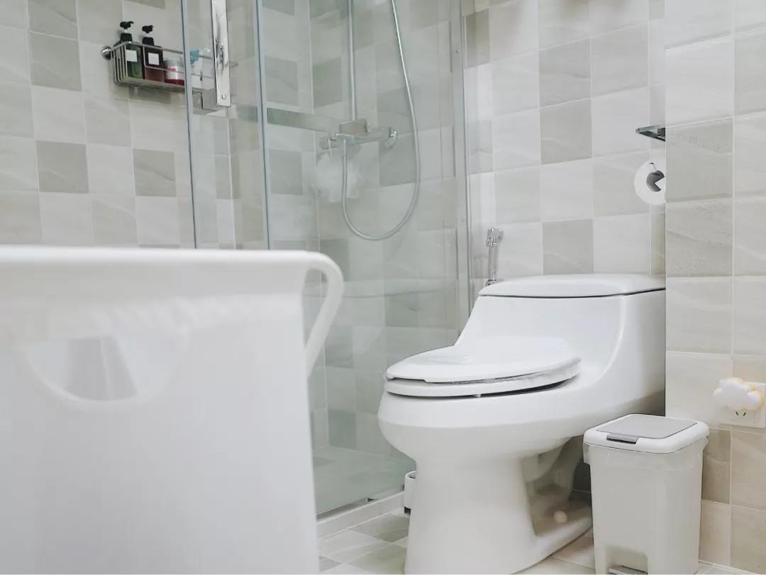 以白和灰作为卫生间的主色调,利用玻璃淋浴房做了简单的干湿分离。