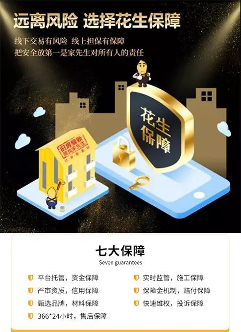 家先生花生保障7大免费装修保障,5分钟售后响应,快速维权100%解决,让用户掌握主动权。在翻新完成后,有任何问题可随时致电我们,家先生将给您最贴心的售后。