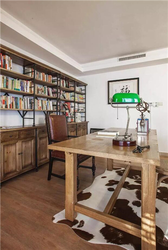 原木色系的茶几与鹿角灯饰使得书房有了一丝自然主义的色彩。