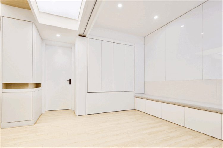 为确保收纳空间的充足,将整面墙都做成橱柜,弹开器设计,保证了平时墙面的简洁性。