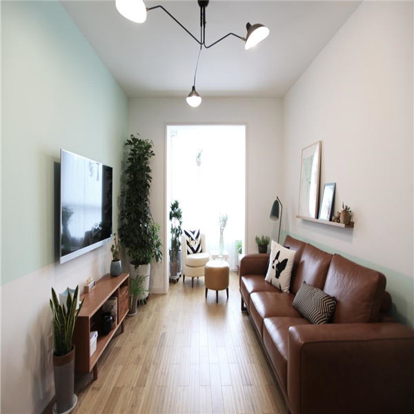 客厅以绿色为主要色调,整体简洁、干净,明快。电视背景墙与沙发背景墙采用了互补的绿色半墙设计。