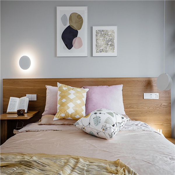 靠背加长的主卧床,插座也直接开孔安装,简单的隔板充当了床头柜的作用,一体化的颜值超高。