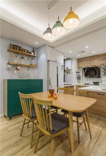 餐客厅一体的结构,墨绿色的餐边柜作为点睛之笔。
