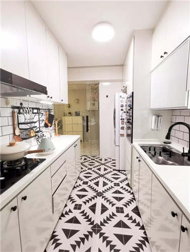 白色的橱柜,台面,搭配上鱼骨纹的地砖,十分的耐看。
