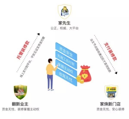 交付款项交由家先生平台线上托管,资金100%安全保障,节点验收后才逐项放款给家先生服务门店。验收完毕后用户再行支付下一阶段款项,避免钱款交付完毕后马虎施工,确保施工质量,充分掌控施工主动权。