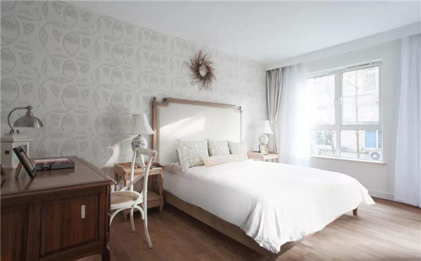 客卧色调偏简洁、素雅,从床头背景墙、到床单,再到窗帘,均采用了浅色色系的材质,在壁纸简单图案的衬托下,显得自由、舒适。