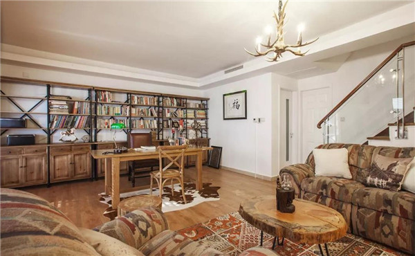 原木色系的茶几与鹿角灯饰使得书房有了一丝自然主义的色彩。