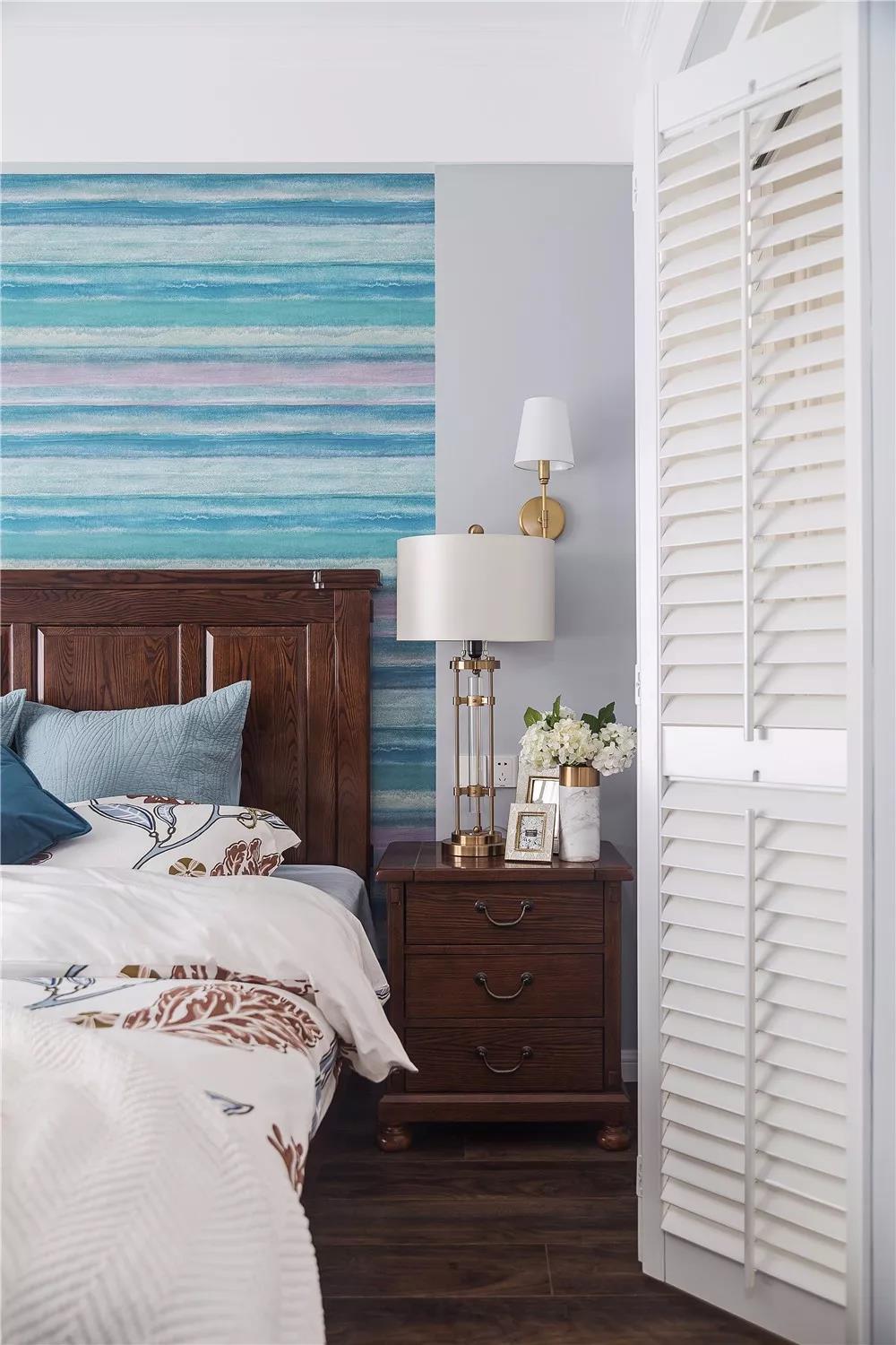 主卧床头背景墙采用了海蓝色墙纸,用灰色墙面进行衬托,简洁、大方!