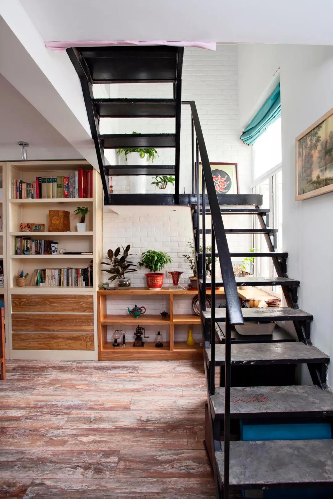 将楼梯的外表拆掉,露出钢板的内部结构,减少了楼梯对窗户的遮挡,为客厅带来充足的光源。同时将楼梯下方的餐桌移走,将这一低矮的空间留给花花草草。